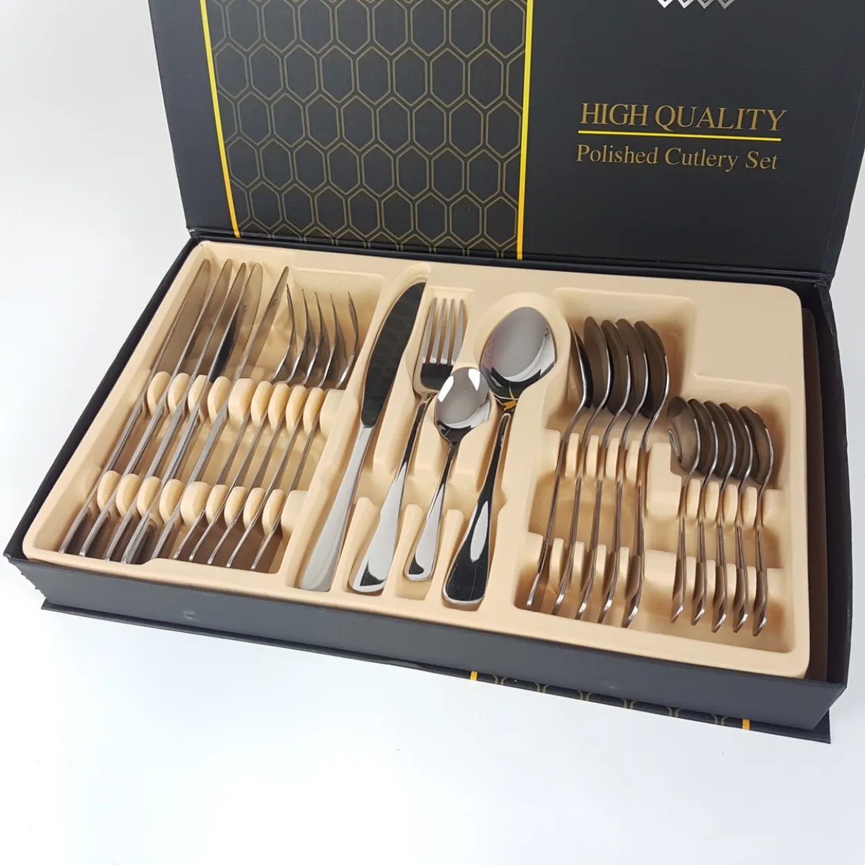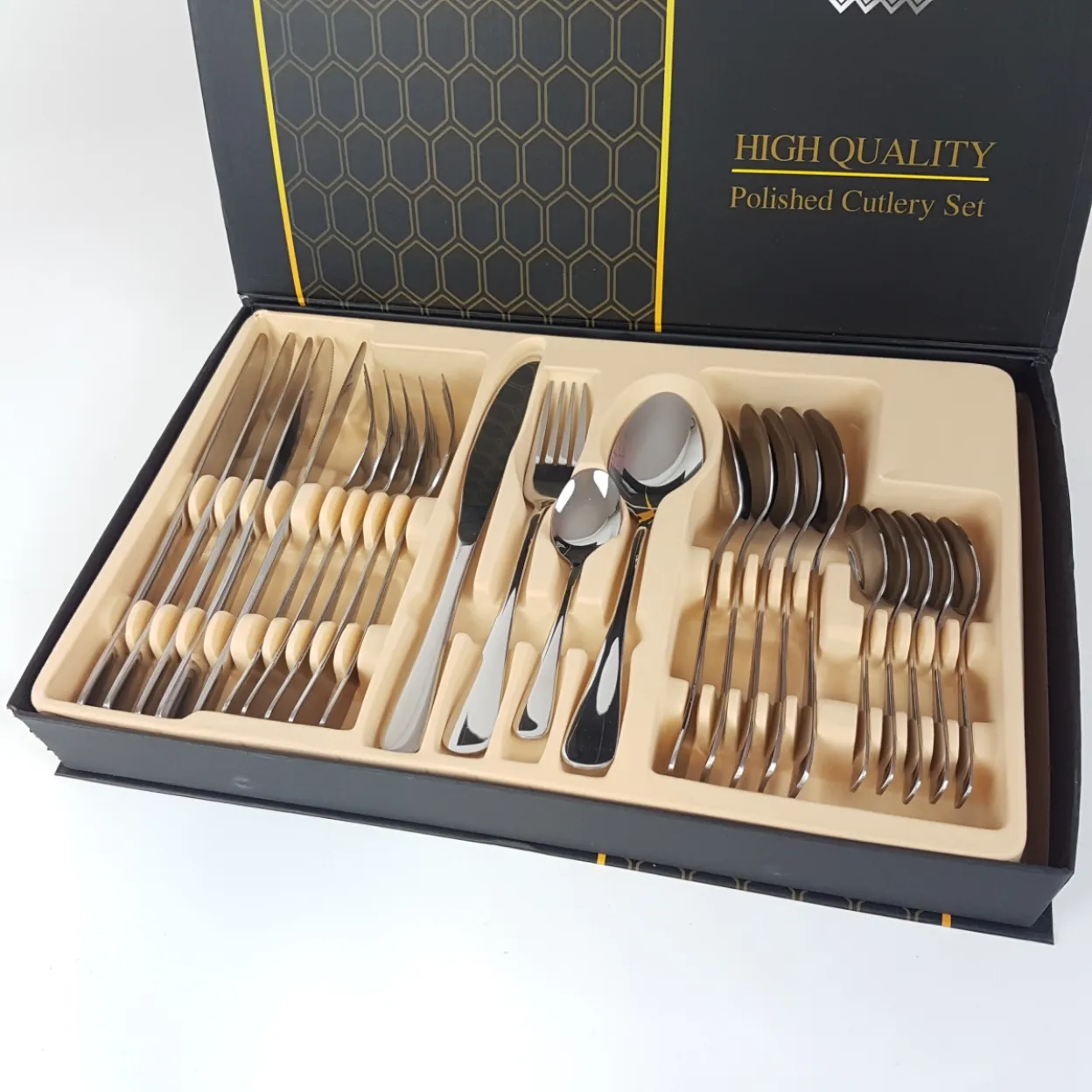 Set za 6 Osoba: Kompletan set za jelo namijenjen je za 6 osoba, uključujući vilice, noževe, žlice i desertne žlice.
