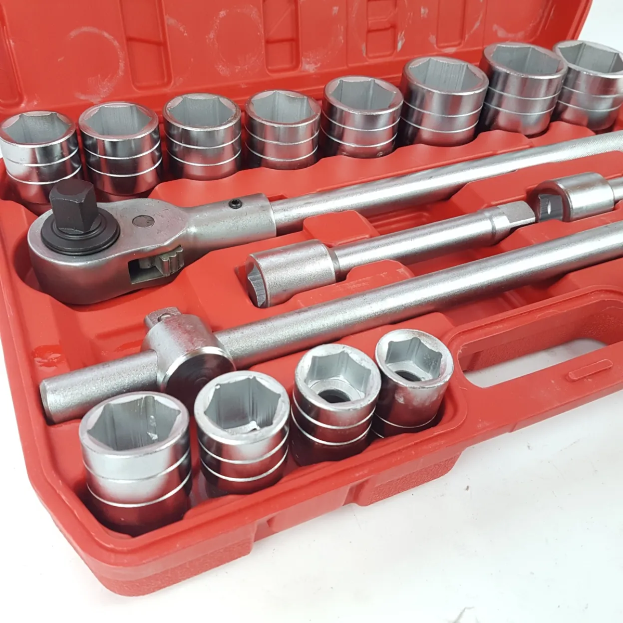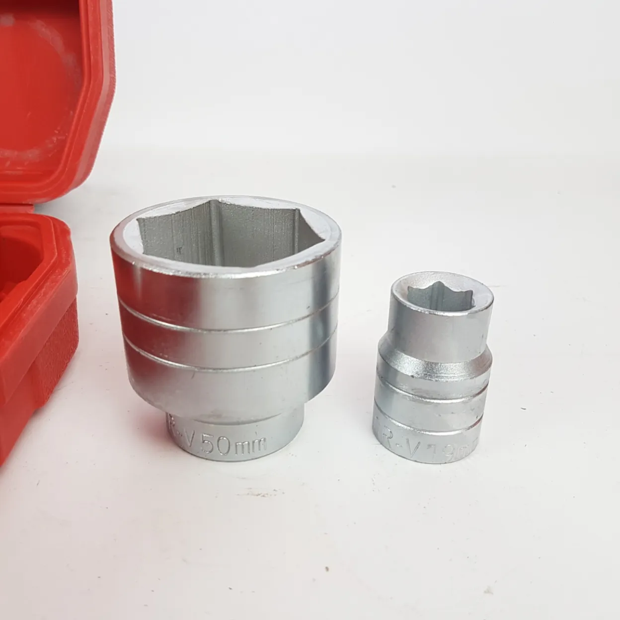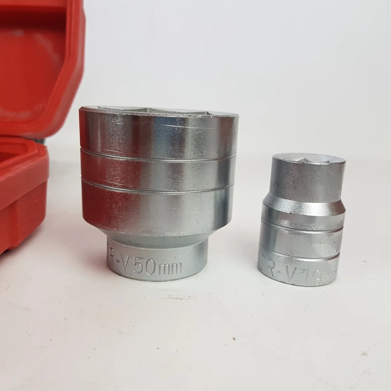Set dolazi s prihvatom 3/4", što omogućuje rad s velikim momentima bez straha od pucanja ili proklizavanja. U kompletu dobivate širok raspon nasadnih ključeva (19–50 mm), što pokriva većinu potreba kod kamiona, traktora i teške mehanizacije.