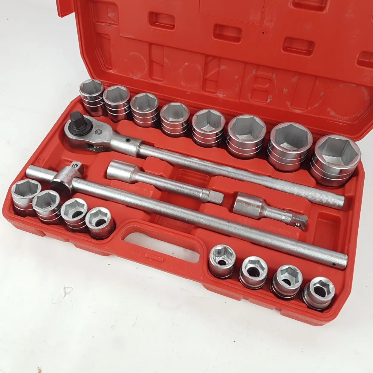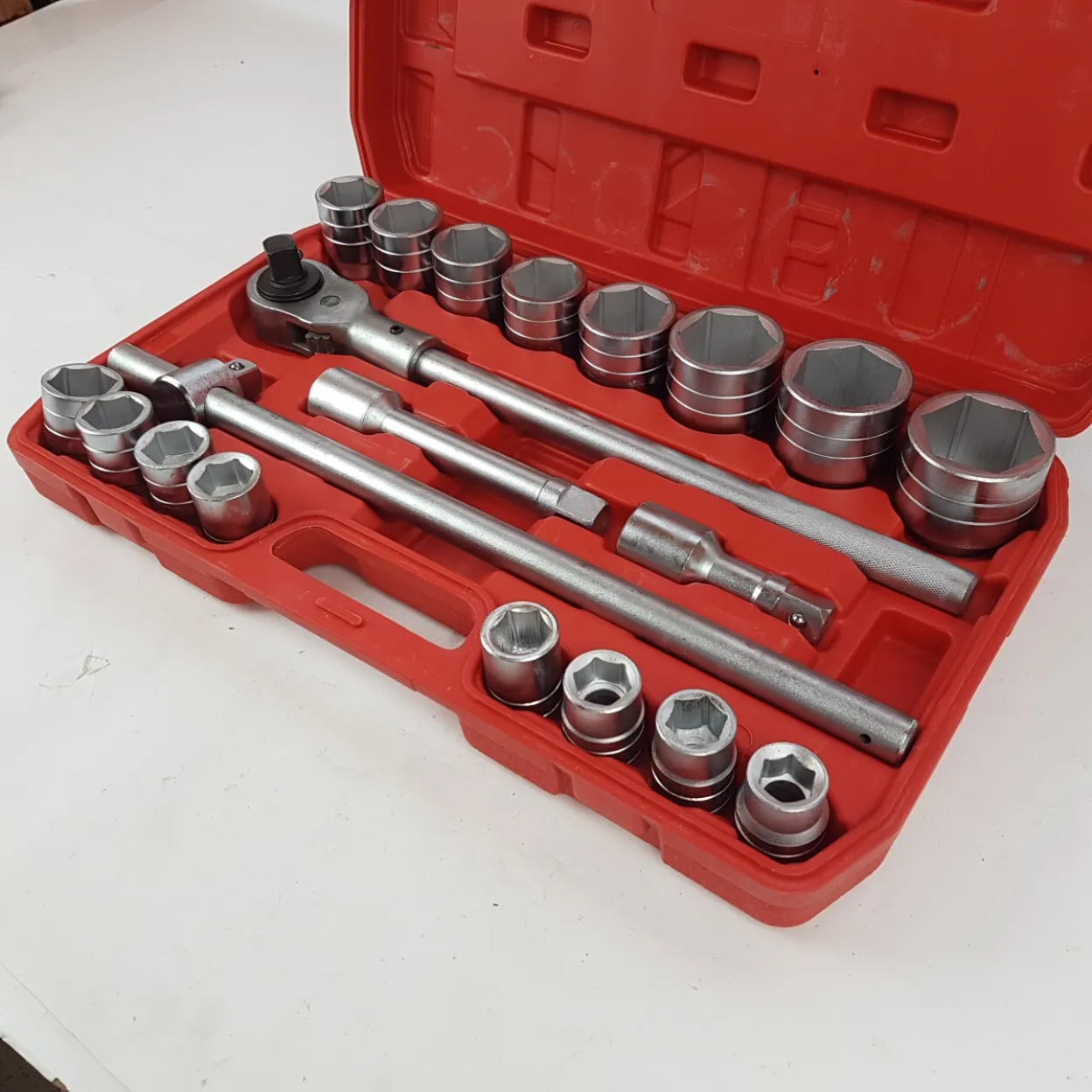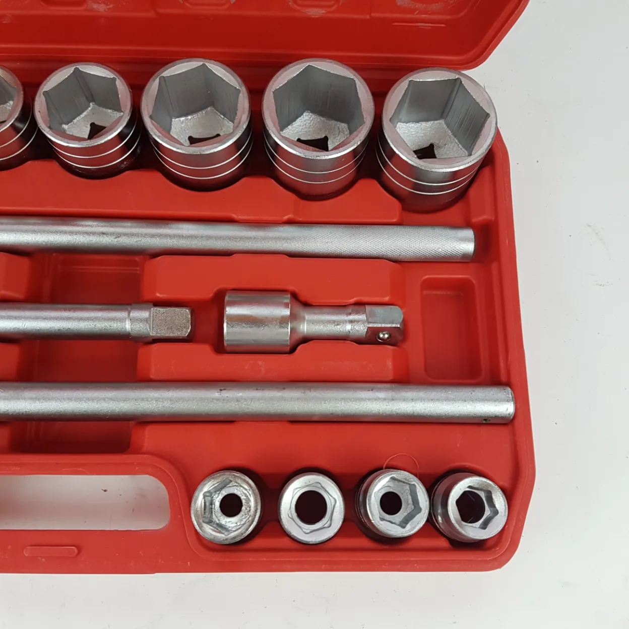Set dolazi s prihvatom 3/4", što omogućuje rad s velikim momentima bez straha od pucanja ili proklizavanja. U kompletu dobivate širok raspon nasadnih ključeva (19–50 mm), što pokriva većinu potreba kod kamiona, traktora i teške mehanizacije.