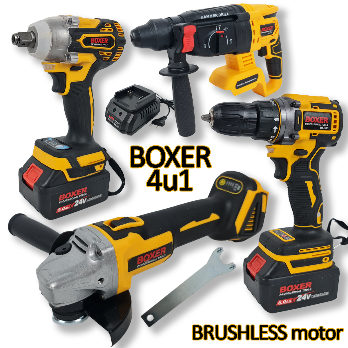 Boxer aku set 4u1 s bušilicom, udarnim odvijačem, kutnom brusilicom i SDS štemericom pruža sve što vam je potrebno za širok spektar zadataka, bilo kod kuće, u radionici ili na gradilištu. Sa svojom naprednom Brushless tehnologijom motora, dvije snažne Li-Ion 5Ah baterije i brzim punjačem, ovaj set nudi vrhunsku izvedbu, dugovječnost i praktičnost, čineći ga neophodnim dijelom vašeg alatnog arsenala.
