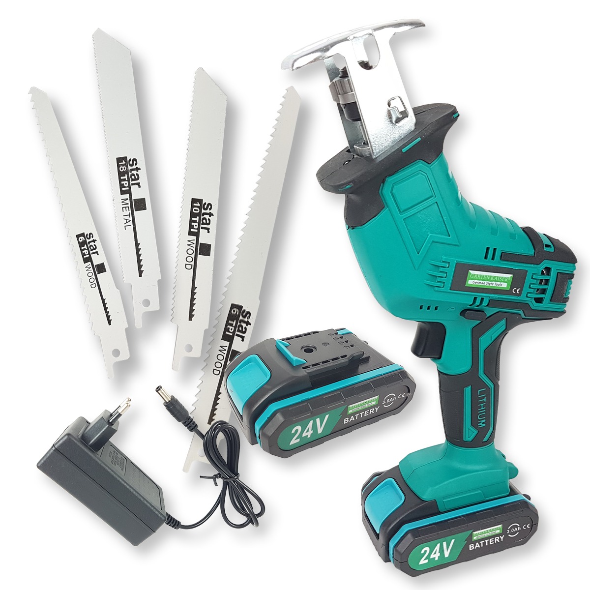 Akumulatorska sabljasta pila s 2 baterije od 24 V i brzim punjačem koji vas neće ostaviti da čekate ni trenutka.